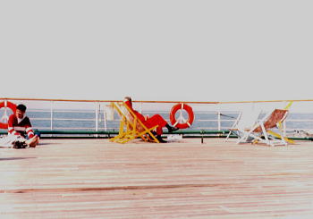 3泊4日の船旅なので夜はそのようにパーティーが組まれているうえに日中もなんだかんだと退屈させない、というほどではないがヒマをつぶすための企画は2,3準備されていた。「船員によるロシア語講座」「操舵室見学会」など。その他「避難訓練」ももちろんある。ここで「ロシア語講座」と言っても期待してはならぬ。が即効性だけはあった。「ドーブラエ・ウートロ」「ズドラーストヴィチェ」「スパシーバ」「ダスヴィダーニァ」などの日々の挨拶から、アレは何と言う、コレは何と言う、という具合に「実用度」という点では非常にためになり、決して「船員による....」だからとバカにはできないのである。