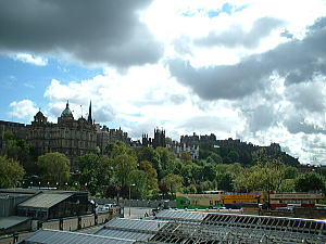 | ニュータウンのプリンシズ・ストリートからオールドタウン方向。右奥がエジンバラ城。下のほうの三角屋根がいくつか並んでいるのは、エジンバラ(ウェーヴァリー)駅。 つかの間の晴れ間の写真。 良く言えば「重厚」、悪く言えば「暗い」のがエジンバラ。 |